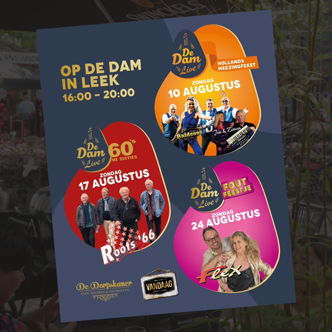 Deze zomer presenteren De Dorpskamer van Leek en Vandaag Hapas & Tapas samen een nieuwe reeks muzikale zondagmiddagen: De Dam Live!