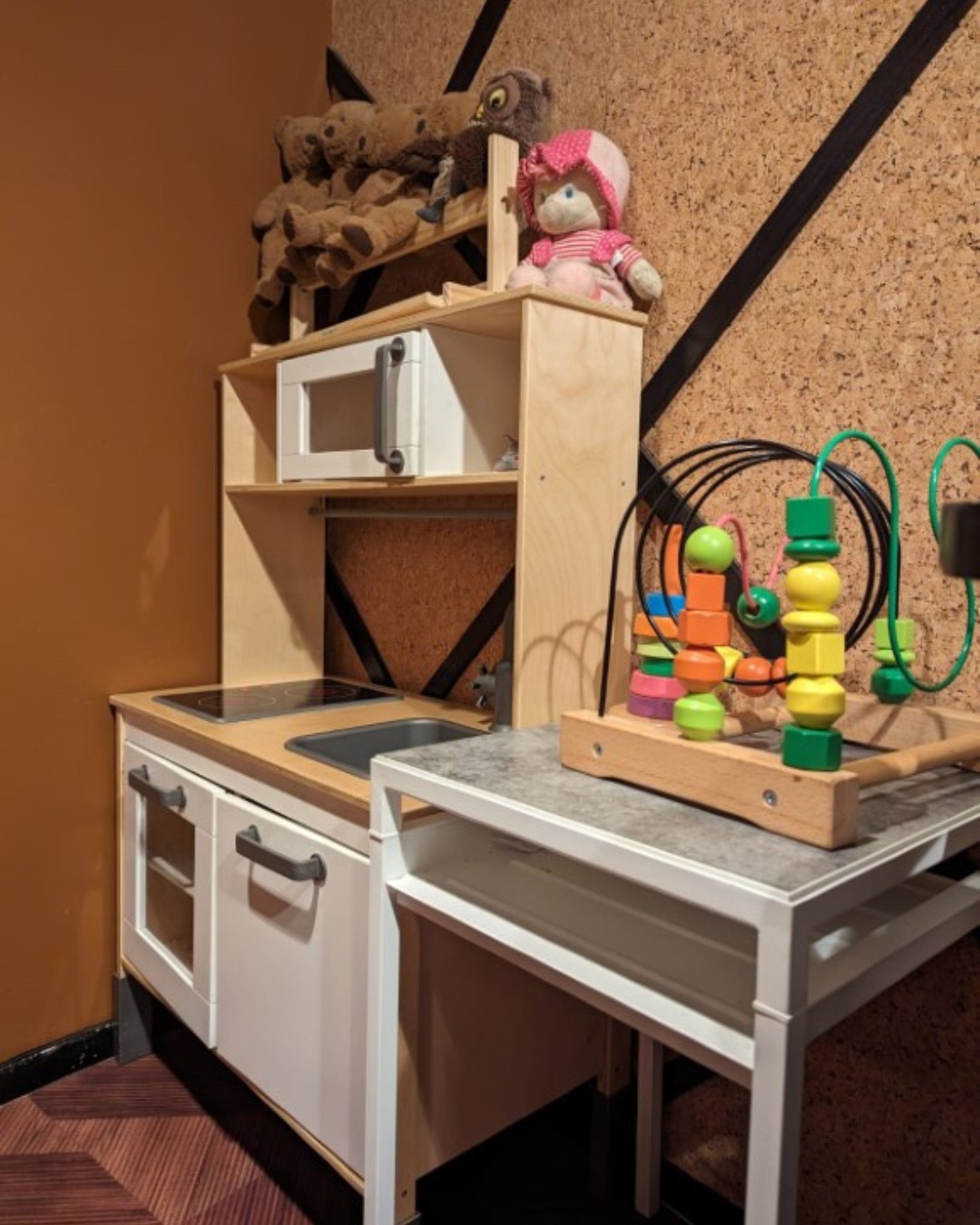 Achterin het restaurant, in de tweede ruimte, is een kindvriendelijk hoekje ingericht met een speelkeukentje, knuffels, kleurpotloden, kleurboeken en ander klein speelgoed. Het is geen grote speelruimte, maar precies genoeg om kinderen even bezig te houden tijdens het bezoek.